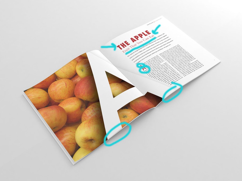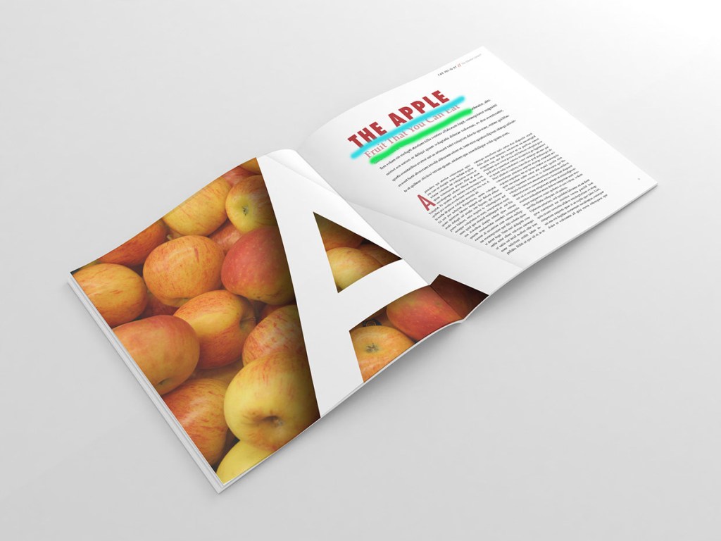 I underlined the two different types of fonts in this magazine spread. The first in blue is larger, all caps, and in bold. The green is smaller uses lowercase letters and is not bold.