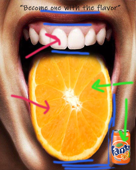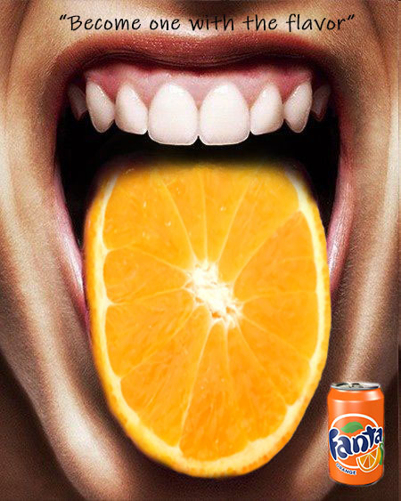 I tried using the same design as the original. I only changed a few things in the design. I chose a slice of orange for the tongue since there is a Fanta in an orange flavor. I found an orange slice with a bright color to contrast with the white of the teeth. I tried to keep everything aligned the same and repeated the orange theme.